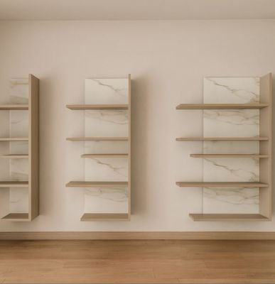Libreria Pentagram in promozione a pannelli in Vetro xGlass Calacatta Gold e mensole in laccato Cocco. La libreria modulare Pentagram si sviluppa a parete dettando il ritmo dell’interior. Mensole essenziali escono a sbalzo dallo schienale conferendo dinamicità e leggerezza. Illuminazione Led inclusa su ciascuno dei 3 blocchi.