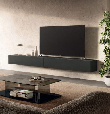 TV unit composta da due contenitori 36e8 di Lago sospesi con anta a ribalta.