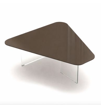 Yama è una tavolino dalla forma asimmetrica firmato Lago. Gambe super leggere in vetro extra chiaro o fumè e piano in Vetro Lucido color Havana