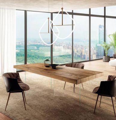 Essenziale e sorprendente, sembra fluttuare nell’aria. Due gambe di cristallo quasi invisibili sostengono il piano del tavolo, che sembra sospeso nel vuoto. Il vetro temperato extra chiaro regala una sensazione di grande leggerezza e porta luminosità negli ambienti in cui è inserito.
